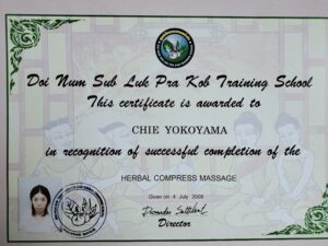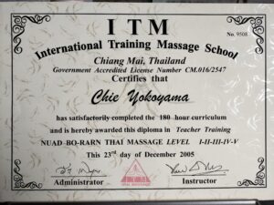 2002年 タイマッサージを始め、「ITM international training massage schoolチェンマイ本校」「Loi-kroh thai traditional Thai Massage school」、「Ong’s Thai Massageschool」 他、定期的にタイへ訪れマッサージを学ぶ。